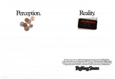 A reklámszakmában létezésünk alapvető, Don Quijote-i (ha úgy tetszik, mátrixi) problematikája – vagyishát: mi a látszat és mi a valóság – a maga vegytiszta formájában érhető tetten. Merthát mivel is foglalkozunk mi reklámosok/marketingesek, de főállásban? Márkaimázst alkotunk, célcsoportot, attitűdöt, hangvételt definiálunk, üzenetet kreálunk – megannyi fabrikátummal dolgozunk, melyek néha köszönőviszonyban sincsenek a valósággal. És ezen még az sem változtat, ha előtte mindent jól lekutatunk az utolsó szögig, mert a végén csak újabb kutatói/értelmezői illúzióval árnyaljuk a dolgokat, igaz, egy ppt prezi formájában, ami mindenképp nagy dolog (konkrét és kézzelfogható; valóságos). Az a helyzet, hogy a reklámos/marketinges elme szinte folyamatosan a képzelet és a valóság mezsgyéjén oszcillál. (Hát nem gyönyörű mondat? De, az.) E kettősség az ötlet mint olyan megítélése és elbírálása kapcsán figyelhető meg a legmarkánsabban. Amikor vannak, akik azt képzelik (idea-phobes), hogy "az ötlet öncélú, úri muri, nem segíti az eladást, csak megzavarja a fogyasztót, elviszi a figyelmét a termékről stb."; míg vannak, akik tudják (idea-fans), hogy "az ötlet gazdasági erő, felhívja a termékre a figyelmet, beakasztja a fejbe, segíti az eladást stb." Erről jut eszünkbe egy remek példa, egy igazi klasszikus: a Fallon/McElligott ügynökség híres Percepció/Realitás kampánya a Rolling Stone magazinnak, valamikor a 80-as évek közepéről – ami igencsak ékes bizonyítékát adja, hogy az "A csapat" percepcióját miként döngöli földbe a "B csapat" realitása. A Rolling Stone magazin akkoriban igencsak nehéz helyzetben volt, merthogy a hirdetők azt gondolták, olvasói befüvezett, csóró és kiöregedett hippik, célcsoportnak korántsem nevezhető egyedek. Nem csoda, hogy nagyon nem is akartak megjelenni a Rolling Stone hasábjain. Pedig a helyzet az ellenkezője volt. Új, fogyasztóképes, duzzadó pénztárcájú olvasótábor vette át a hippitábor helyét. És a hirdetések e megváltozott valóságra építettek: